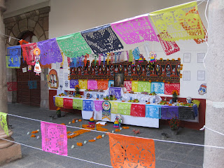 Here are some more photos of the public face of the Day of the Dead celebration we took on Sunday in the old plaza in the heart of Coyoacan. It was a lovely warm sunny day and the plaza and immediate surrounds were packed. The colour and vitality of the scene belied the grim realities in so many other parts of this magical land.